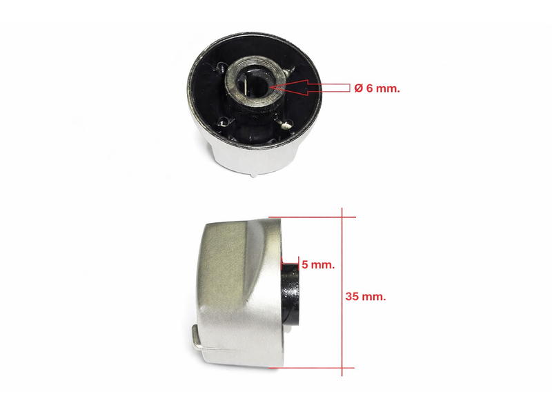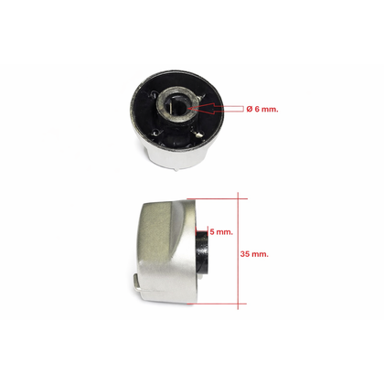Średnica połączenia słupkowego: 6 mm. Występ trzonu: 5 mm Średnica przedłużonej gałki: 35 mm. Kolor: srebrny